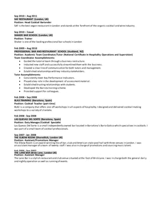 This document provides a summary of Matthew Sims' work experience and qualifications. It outlines his 5 years of experience in liquor sales and marketing in Australia and New Zealand, including roles as a Territory Manager and Brand Ambassador. It also lists his education qualifications, including a BA Hons in Design and certificates in hospitality, education, and art. His work experience demonstrates strengths in sales, marketing, event management, and customer relations.