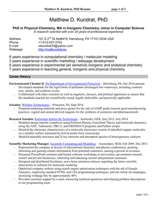 Matthew D. Kundrat has over 20 years of experience in computational chemistry, molecular modeling, experimental inorganic chemistry, scientific marketing, and teaching. He received his PhD in Physical Chemistry from SUNY Buffalo and has worked in research and development roles for organizations like the Karlsruhe Institute of Technology and General Motors. Currently, he is an Environmental Chemist for the Pennsylvania Department of Environmental Protection where he develops standards for pollutant limits.