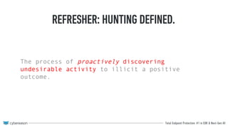 This document discusses maturing a threat hunting program. It provides an overview of threat hunting, including defining the process as proactively discovering undesirable activity to elicit a positive outcome. It reviews the hunting process of having a motivation/hypothesis, collecting data, using tools for analysis, and achieving outcomes. It then discusses how hunting outcomes can improve an incident response process by providing detections, new collection techniques, and prevention capabilities. The document dives deeper into expanded hunting of PowerShell techniques like file-less execution, persistence, network communications, and provides examples of how hunting could escalate incidents or enable prevention controls related to PowerShell.