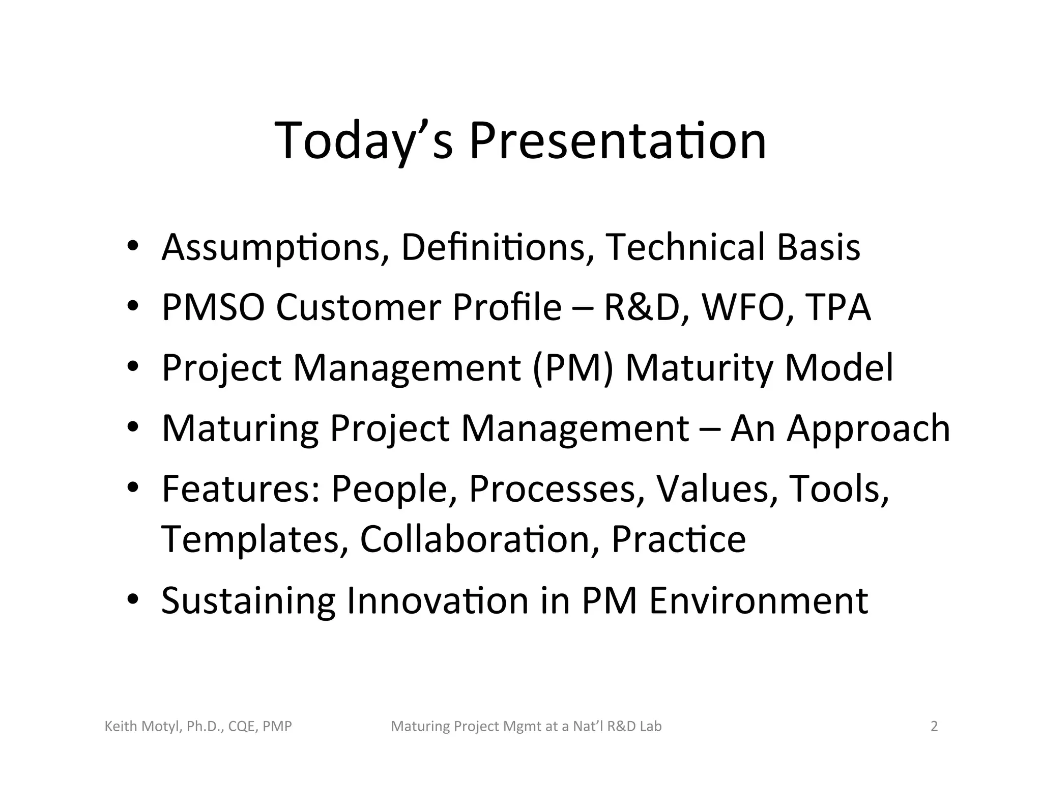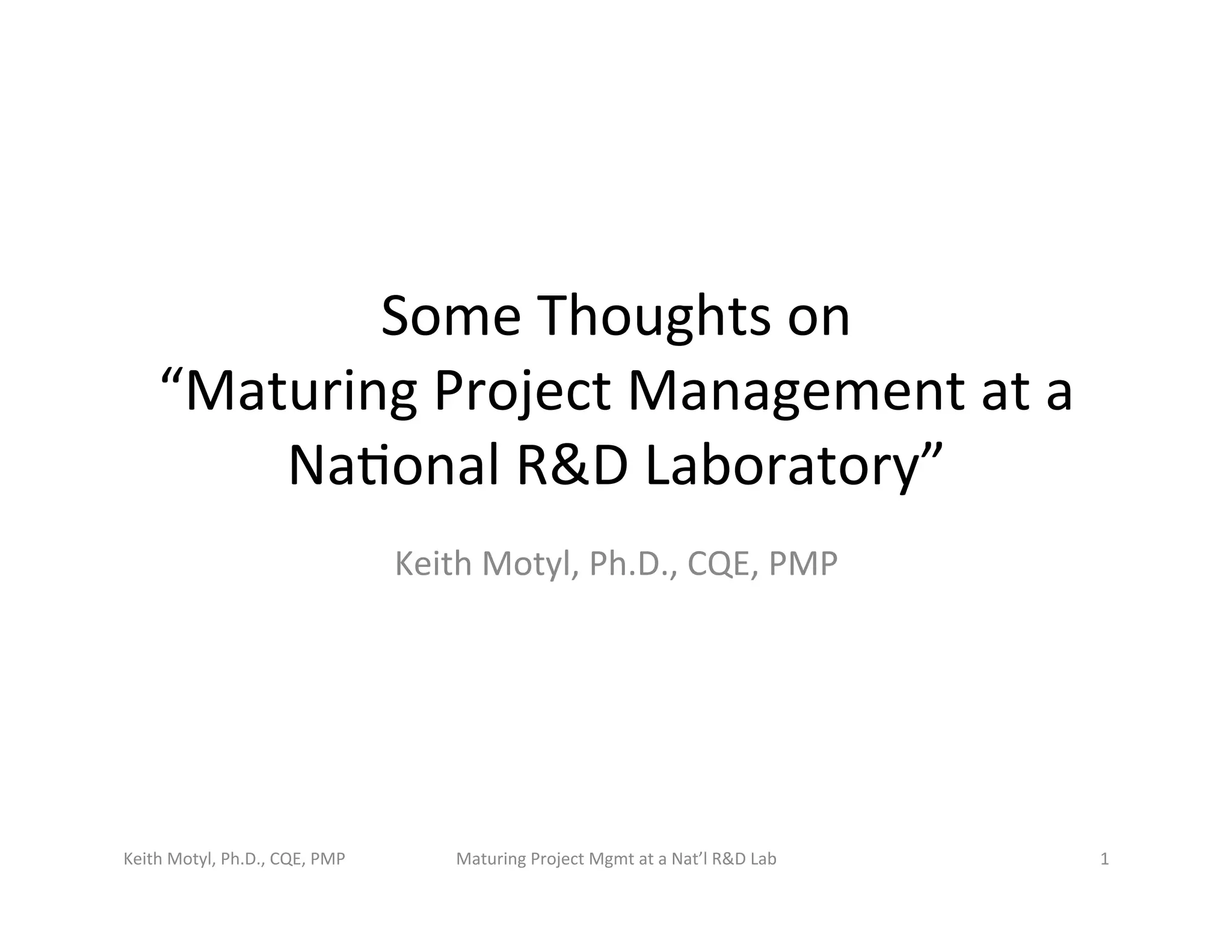 This document discusses approaches to maturing project management practices at a national research and development laboratory. It outlines a flexible maturity model approach using industry standard tools and techniques from PMI. The key elements would include assessing current practices, developing a tailored maturation plan, providing training on PMI methodology, and establishing collaborative channels and templates to gradually improve processes over time with a focus on early successes and demonstrating value.