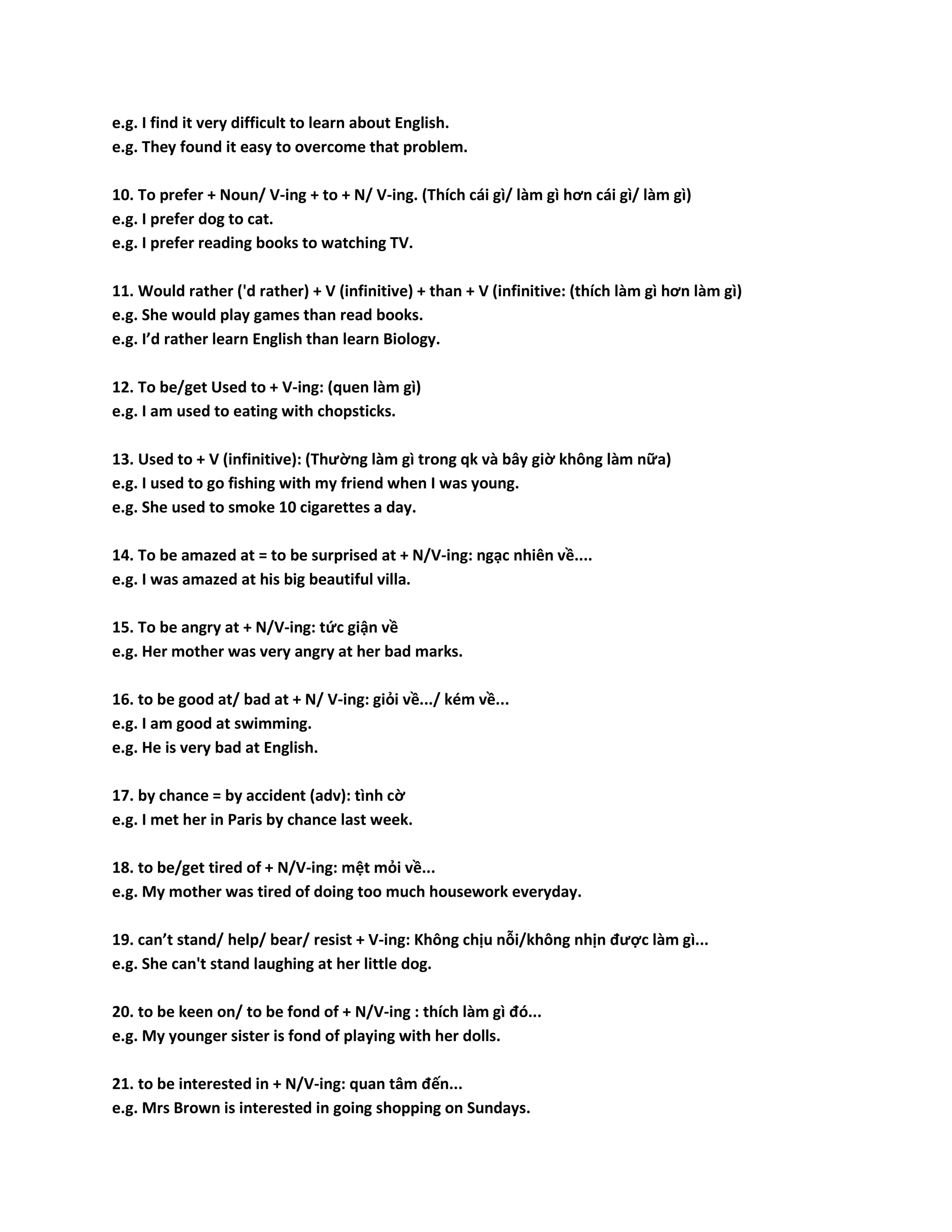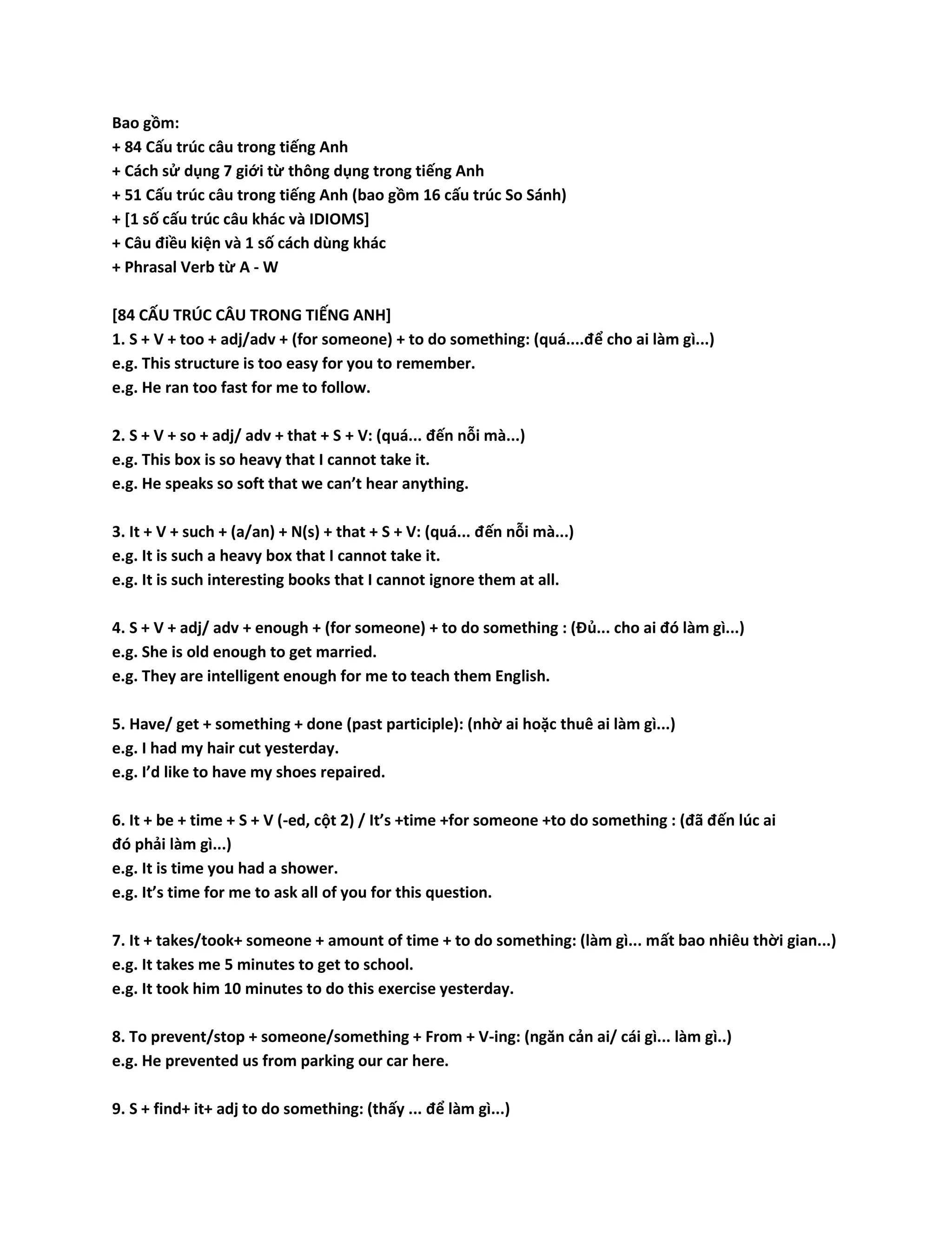 Tài liệu cung cấp 84 cấu trúc câu tiếng Anh, bao gồm cách sử dụng 7 giới từ thông dụng và nhiều cấu trúc phức tạp như câu điều kiện và phrasal verb. Nó chứa ví dụ cụ thể cho từng cấu trúc, giúp người học nâng cao kỹ năng ngôn ngữ của mình. Ngoài ra, tài liệu còn đề cập đến cách thế hiện cảm xúc và ý kiến trong giao tiếp.