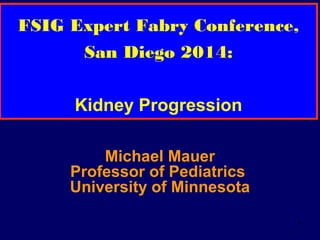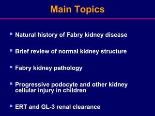 This document summarizes a presentation on kidney progression in Fabry disease. It discusses the natural history of Fabry kidney disease and pathology. Studies show a progressive decline in kidney function with age for untreated males and females with Fabry disease. Kidney pathology involves the accumulation of globotriaosylceramide inclusions in various kidney cell types including podocytes. Enzyme replacement therapy can help clear inclusions, but not completely, and higher doses of ERT may lead to better renal outcomes than lower doses. Early treatment may provide long-term renal benefits.