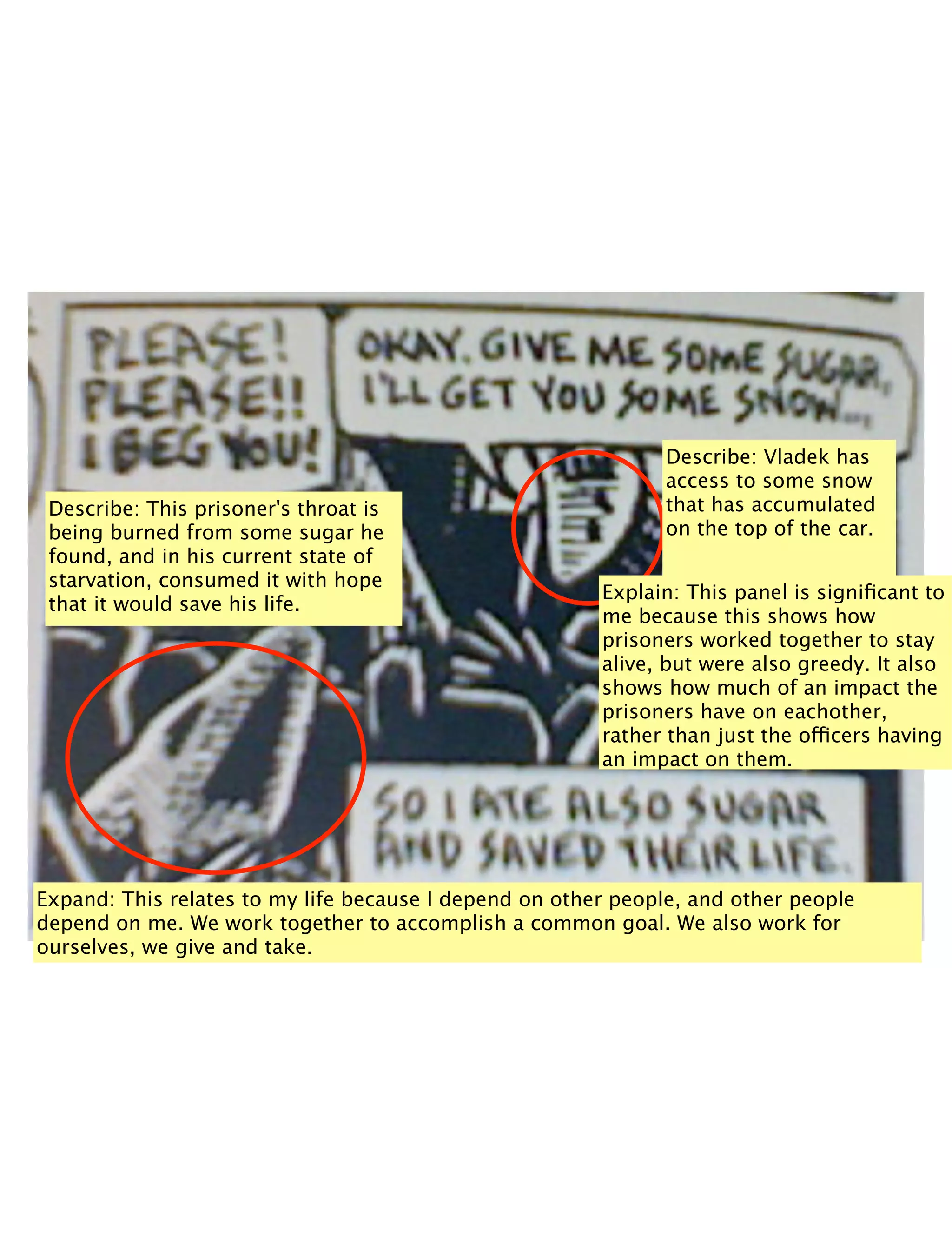 This panel from a graphic novel depicts a starving prisoner consuming sugar in hopes of saving his life, despite it burning his throat, showing the desperation of prisoners. It also shows another prisoner with access to snow on top of a car, demonstrating how prisoners helped and competed with each other for resources. The panel is significant as it illustrates how prisoners impacted one another both cooperatively and greedily in their struggle to survive.