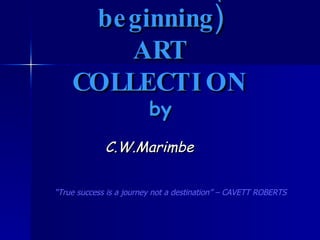 This document provides a listing of artworks by artist C.W. Marimbe that make up their MAVAMBO art collection. Over 50 pieces are listed, along with their titles, dimensions, medium, and whether they have been sold. Contact information is provided at the end for purchasing arrangements or commissioning work from the artist.