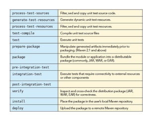This document provides an overview of Maven, including what it is, how to set it up, the project object model (POM), relationships between Maven projects, executing Maven commands, built-in lifecycles, dependency management, and common problems and activities when using Maven. Maven is a build automation tool used primarily for Java projects to manage dependencies, build processes, documentation, and project metadata. Key aspects include the POM file which defines the project structure and dependencies, relationships between parent and child projects, and Maven's built-in lifecycles for compiling, testing, packaging, and deploying code.