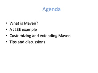 Maven is a Java project management and build tool that uses a Project Object Model (POM) defined in XML files to manage a project's build, reporting and documentation from a central information source. It is based on a small core with numerous plugins that can be used to compile code, run tests, generate documentation and more. Maven uses local and remote repositories to download dependencies and build artifacts that projects specify in their POM files.