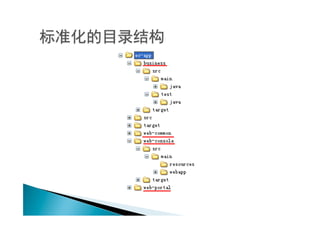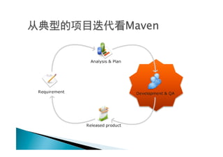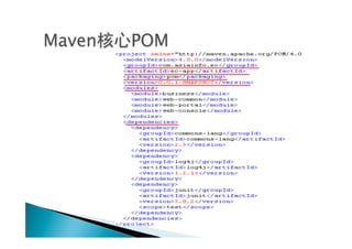 The document discusses Maven, an open source tool used primarily for automating build, management and reporting in Java-based projects. It covers Maven concepts like the project object model (POM), dependencies, plugins and common Maven commands. It also provides instructions for installing Maven and creating basic Maven projects.