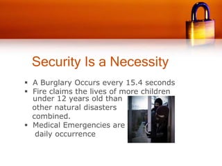 The document discusses the urgent need for comprehensive security solutions, highlighting that a burglary occurs every 15.4 seconds. It presents the 'maximum security advantage' through a one-stop shopping approach for alarm monitoring and equipment, emphasizing benefits such as cell backup systems, monitored fire and medical systems, and special packages for various customer scenarios. The target audience includes new homeowners, individuals with medical conditions, and those seeking to reduce insurance rates.