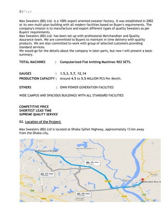 1. Max Sweaters (BD) Ltd is a sweater factory established in 2002 in Bangladesh that exports sweaters. It has over 900 knitting machines and a production capacity of 4.5-5.5 million pieces per month.