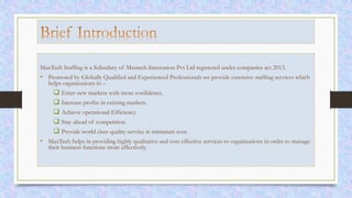 Maxtech Staffing, a subsidiary of Maxtech Innovation Pvt Ltd, specializes in providing extensive staffing and HR services, enabling organizations to enhance operational efficiency and gain competitive advantage. With a team of qualified professionals, they offer solutions in payroll management, recruitment, training, and legal support across various industries. Their commitment to client satisfaction and tailored service helps businesses manage human capital effectively while reducing costs.