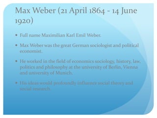 Max Weber was a German sociologist and political economist known for his ideas of ideal types, social action, and forms of authority and legitimacy. Some of his major works examined the Protestant work ethic and relationship between Protestantism and the rise of capitalism. He is considered a founder of sociology and developed concepts such as ideal types, which are analytical constructs used for comparative analysis. Weber saw sociology as the science of interpreting social action and delineated four types: rational, value-rational, traditional, and affectual. His theories profoundly influenced social science.