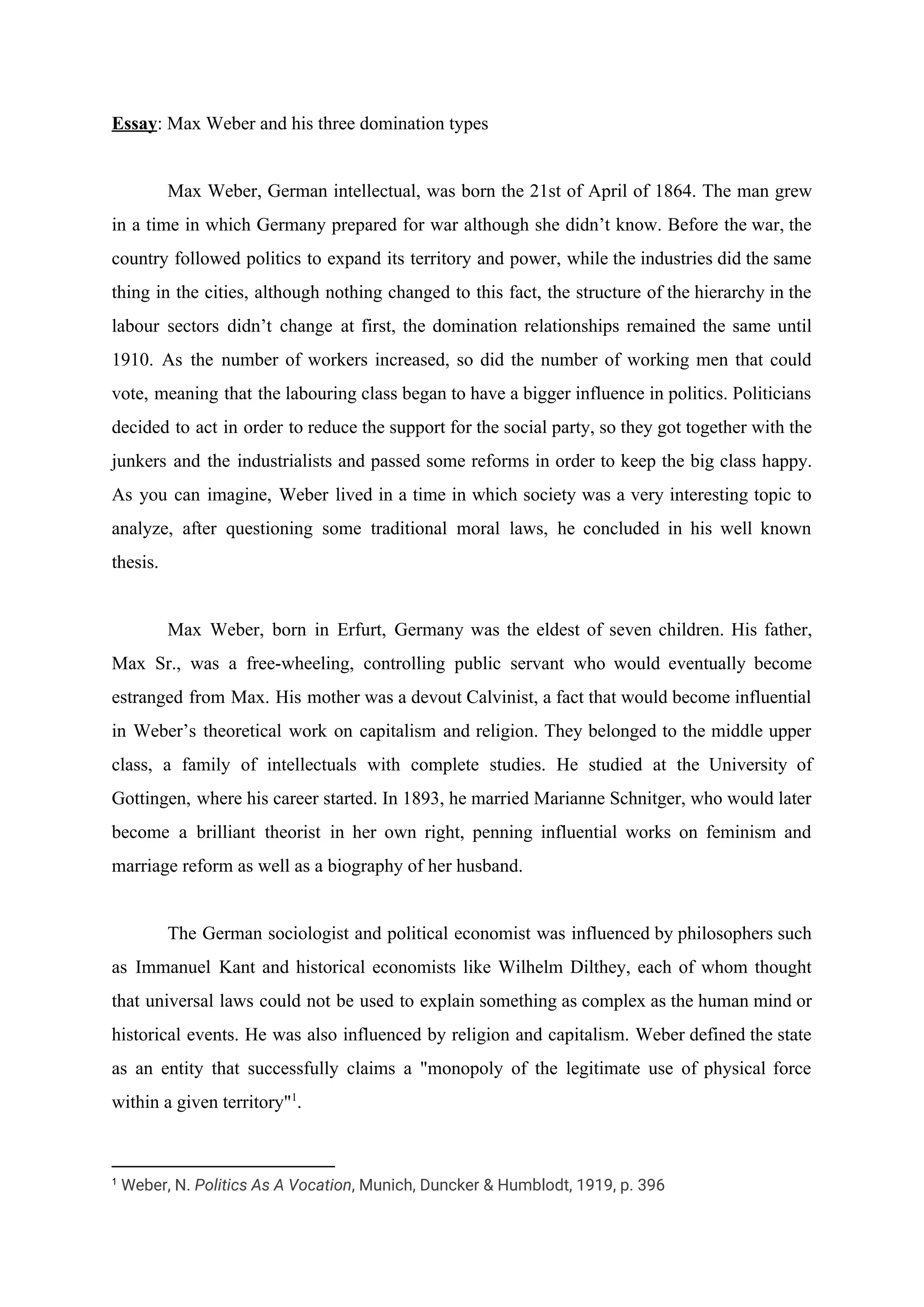Max Weber was a German sociologist who analyzed forms of social and political organization. He identified three types of legitimate domination: charismatic, traditional, and rational-legal. Charismatic domination relies on devotion to an exceptional leader. Traditional domination accepts the authority of dominant individuals or groups based on tradition or culture. Rational-legal domination follows an established legal system with written rules and regular political procedures. Weber believed rational-legal domination would become more prevalent and that it should be applied in Germany to move beyond traditional systems.