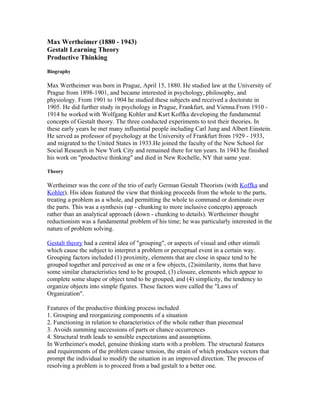 Max Wertheimer was a pioneering psychologist who developed Gestalt theory with Wolfgang Kohler and Kurt Koffka. He studied psychology in Prague and Germany before working with Kohler and Koffka to develop the concepts of Gestalt theory through experiments from 1910-1914. He believed thinking proceeds from the whole to parts rather than analyzing details. He emphasized laws of organization and productive thinking to solve problems by modifying situations. Wertheimer helped establish Gestalt as a major learning theory, rejecting stimulus-response models in favor of a holistic view of grasping structural wholes.