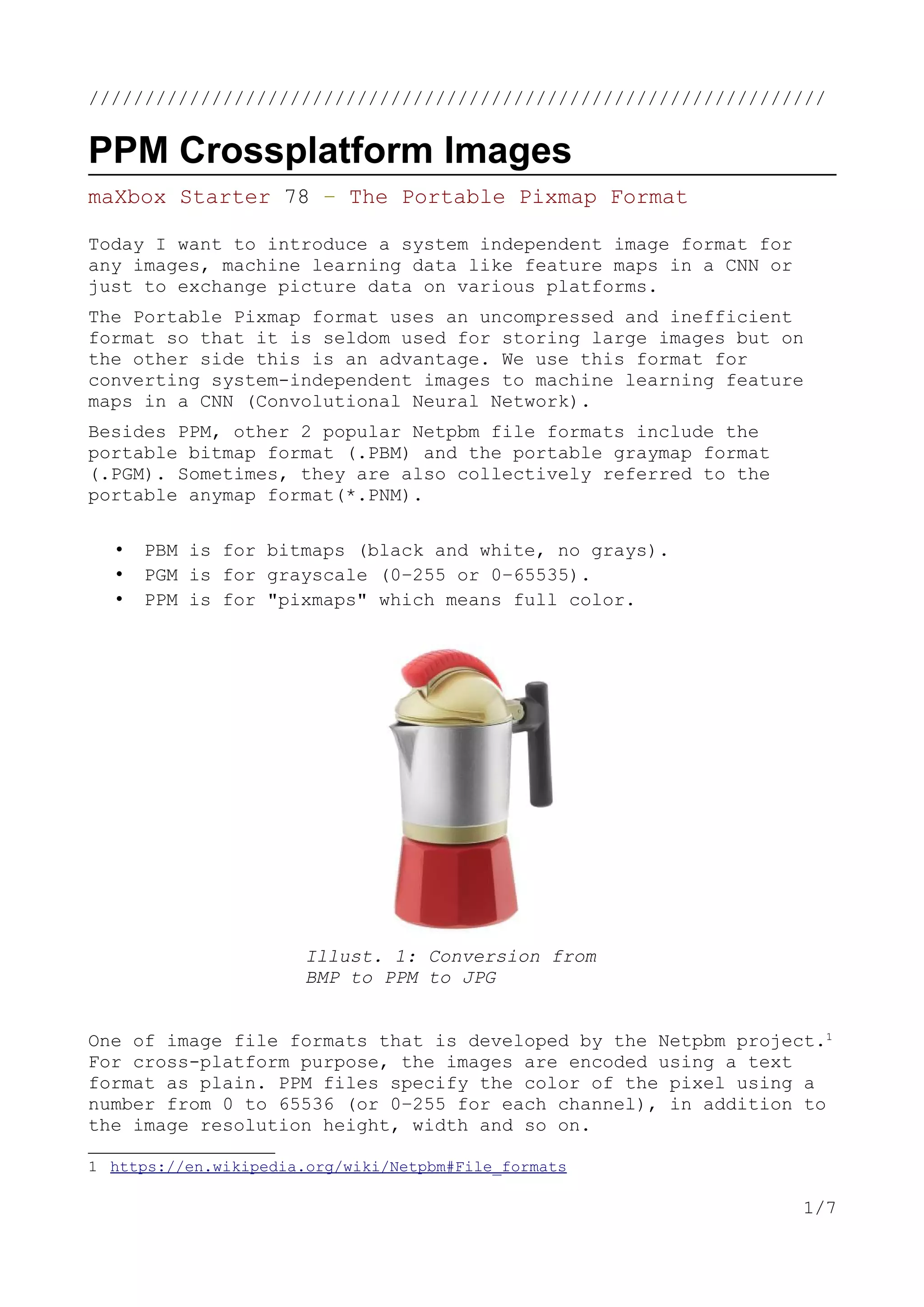 The document discusses the Portable Pixmap Format (PPM) and its use for system-independent image handling, particularly in converting images to machine learning feature maps for convolutional neural networks. It details PPM's structure, including its headers and data representation, and compares it with similar formats like Portable Bitmap (PBM) and Portable Graymap (PGM). The document also includes code examples for saving bitmaps as PPM and techniques for converting images for object detection.