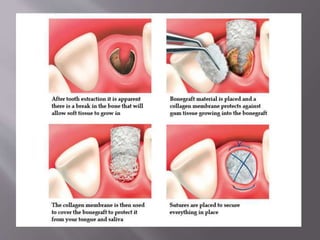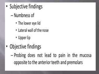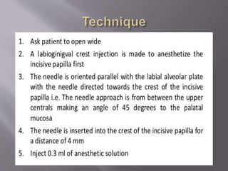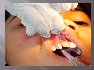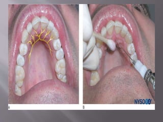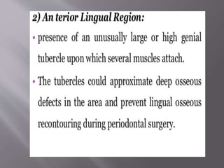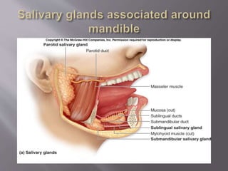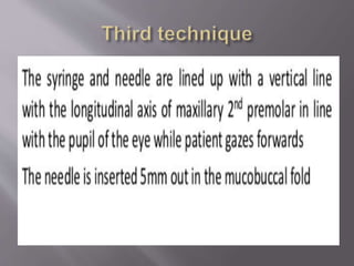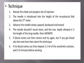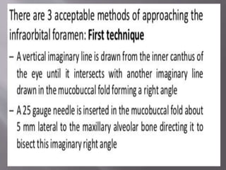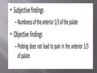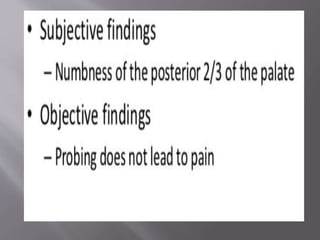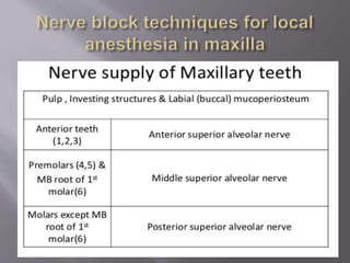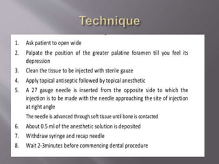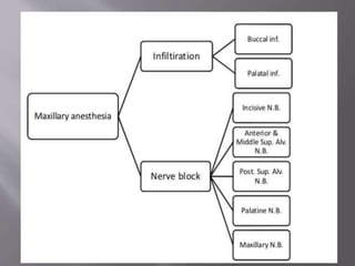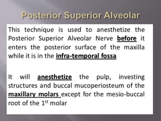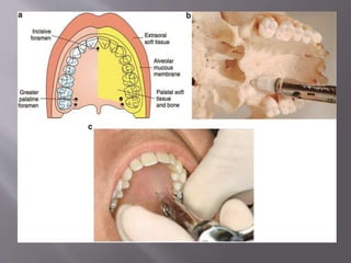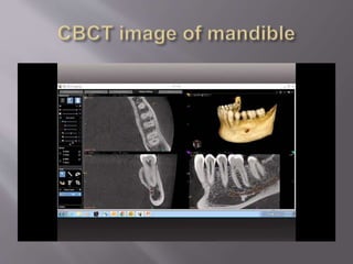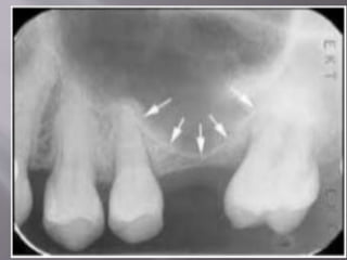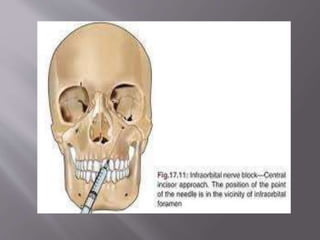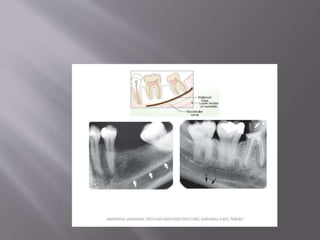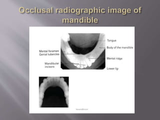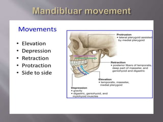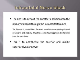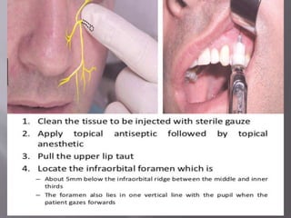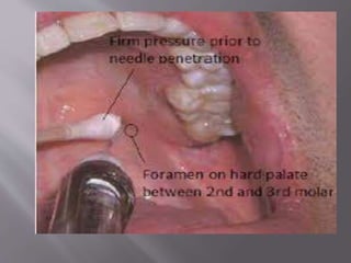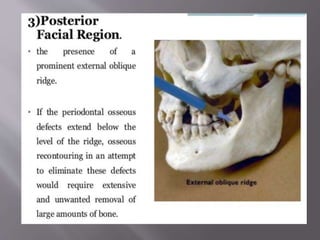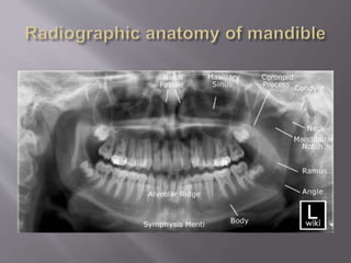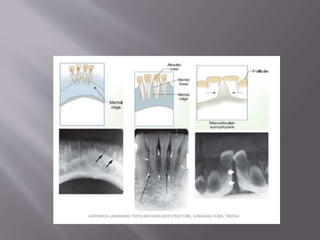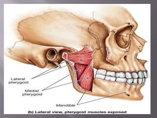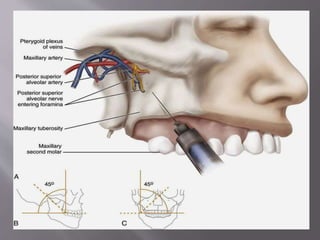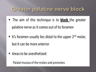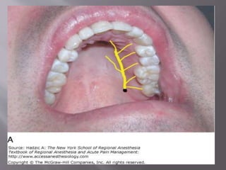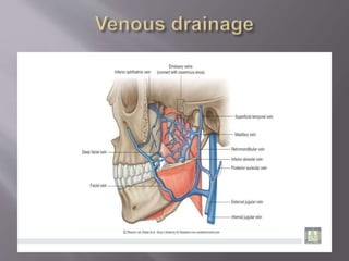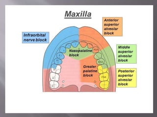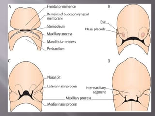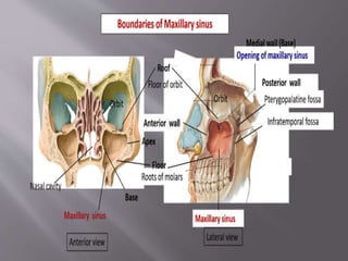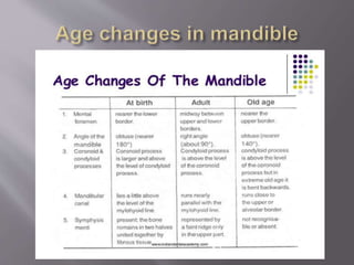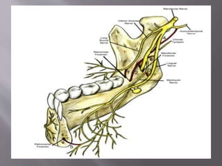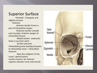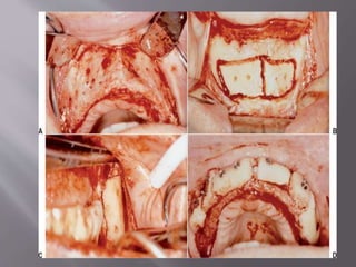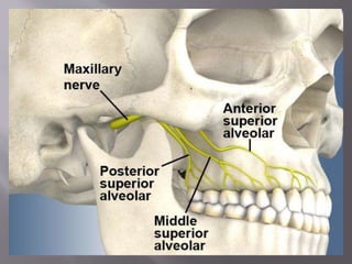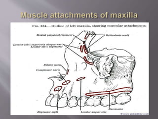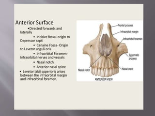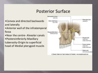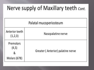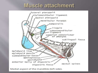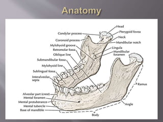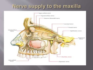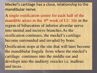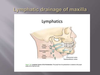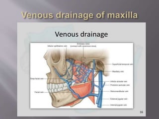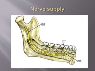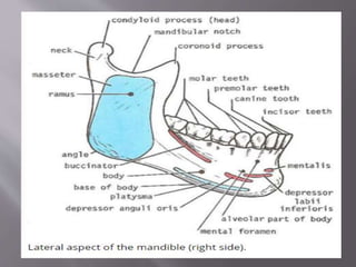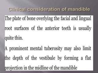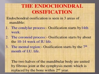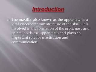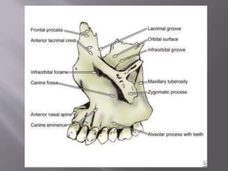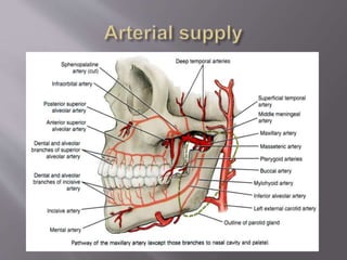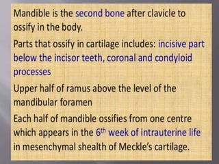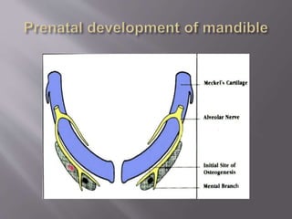 The document discusses the development of the maxilla and mandible. It describes how the maxilla develops from the maxillary processes and fuses in the midline. It also discusses palate development including primary and secondary palate formation. The mandible develops from the first pharyngeal arch. The document outlines the anatomy and blood supply of the maxilla and mandible. It also discusses clinical implications such as maxillary sinus augmentation and inferior alveolar nerve blocks.
