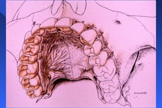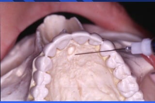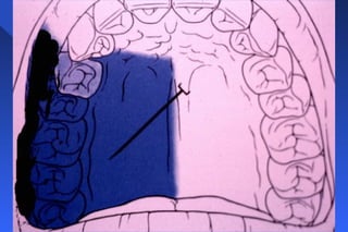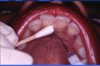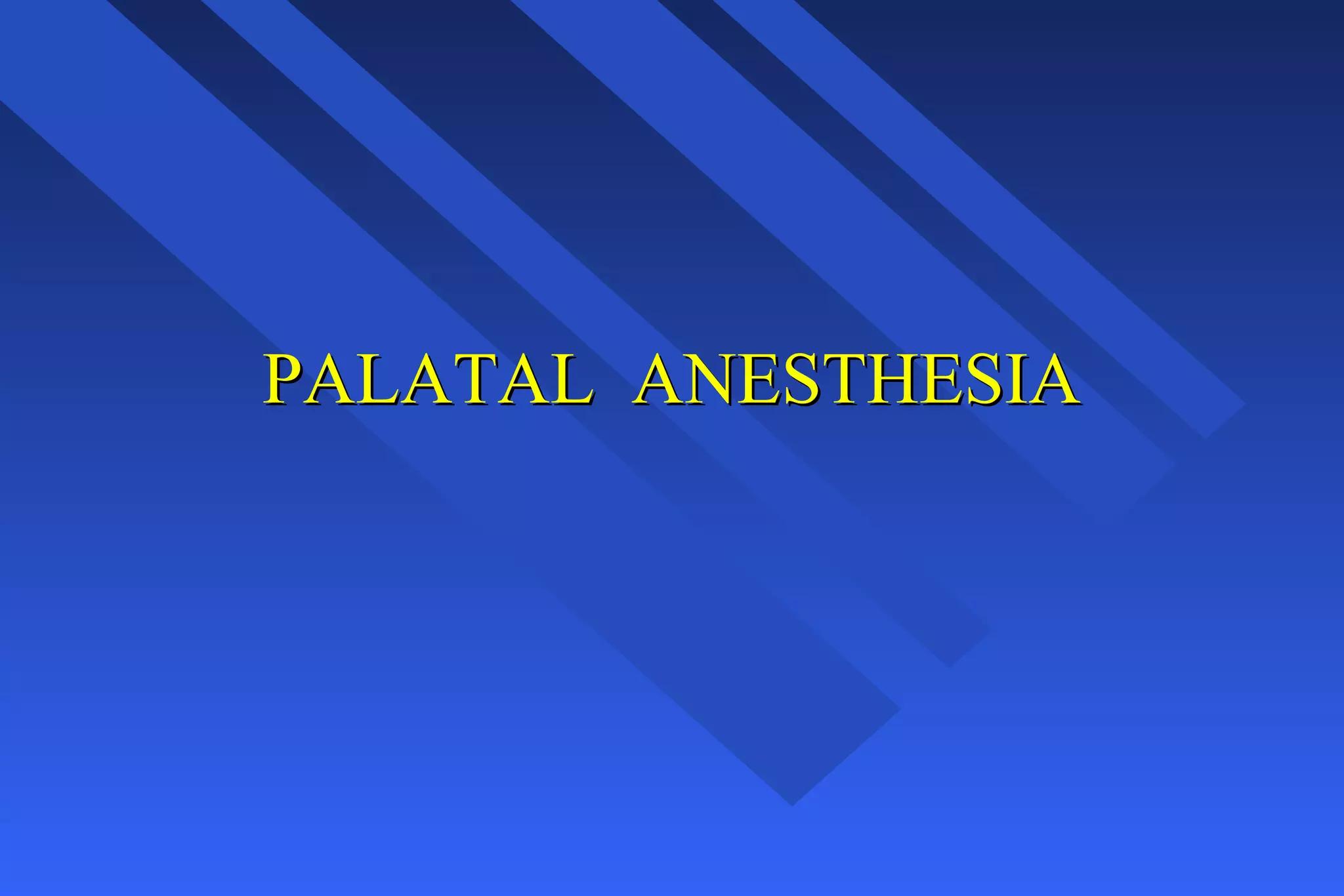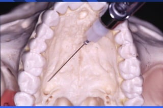 This document provides information on palatal anesthesia techniques, including greater palatine and nasopalatine nerve blocks. It describes the indications, contraindications, advantages, disadvantages, alternatives, landmarks, precautions, techniques, potential failures, and complications for each nerve block. The goal of these techniques is to provide pain control in the hard and soft tissues of the posterior or anterior palate for dental procedures by injecting a small volume of local anesthetic near the targeted nerve.