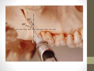 This document discusses various techniques for local anesthesia in the maxilla. It begins by defining local infiltration, field block, and nerve block injections. It then describes specific maxillary injections including supraperiosteal, intraligamentary, intrapulpal, intraosseous, intraseptal, and various nerve blocks of the anterior superior alveolar, middle superior alveolar, and greater palatine nerves. For each technique, it provides indications, contraindications, anatomy anesthetized, complications and failure causes. The anterior superior alveolar nerve block is described in detail as the most common and effective maxillary nerve block.