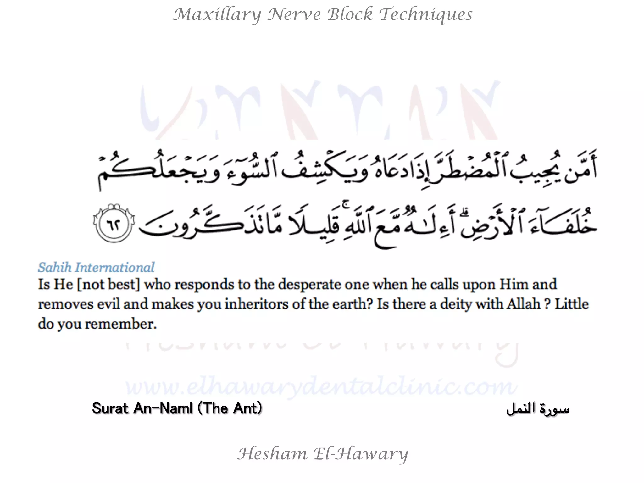 This document discusses techniques for maxillary nerve blocks. It begins by describing the anatomy of the maxillary nerve and its branches that supply sensation to the upper teeth and gums. It then explains in detail the posterior superior alveolar nerve block technique, including patient and dentist positioning, needed equipment, landmarks, injection technique, and confirming anesthesia. Finally, it provides a brief overview of the maxillary nerve block technique to anesthetize the main trunk of the maxillary nerve.