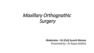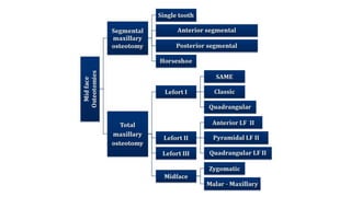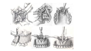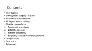 The document outlines maxillary orthognathic surgery, focusing on its definition, history, goals, and procedures such as Le Fort osteotomies. It discusses anatomical considerations, complications, and emphasizes the importance of wound healing in surgical outcomes. The text also encapsulates various surgical techniques, indications, and historical developments in orthognathic surgery, providing a comprehensive overview of the subject.
