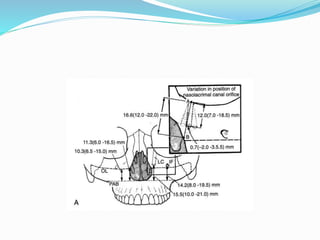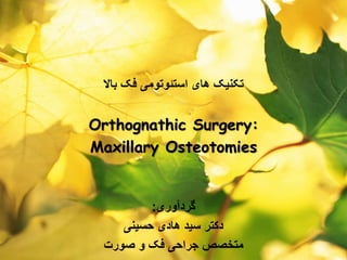This document summarizes various techniques for maxillary osteotomies. It discusses Lefort 1 osteotomy, Lefort 1 segmental osteotomy, Lefort 3 osteotomy, subcranial Lefort 3 osteotomy, modified Lefort 3 osteotomy, and transverse maxillary distraction osteogenesis. For each technique, it provides information on history, indications, surgical anatomy, technique, complications, and modifications when applicable. The document is a guide for orthognathic surgeons on different maxillary osteotomy procedures.
