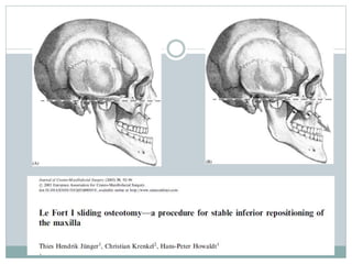 The document provides an overview of maxillary osteotomy procedures, detailing the historical development of orthognathic surgery, therapeutic goals, and treatment planning sequences. It outlines various types of maxillary osteotomies, their indications, anatomical considerations, surgical techniques, and the biological basis for these procedures. Additionally, it discusses complications and the importance of preserving vascular supply to ensure successful outcomes.