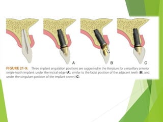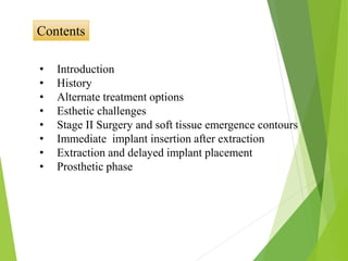 This document summarizes key information about replacing a single missing tooth in the maxilla with an implant. It discusses the history of this procedure, esthetic challenges, ideal implant positioning, and surgical techniques for soft tissue management. Immediate implant placement after extraction and delayed placement are also compared. The replacement of a maxillary anterior tooth with an implant is considered one of the most difficult procedures in implant dentistry due to strict esthetic demands. Proper three-dimensional implant positioning and soft tissue shaping are essential for achieving an optimal esthetic outcome.