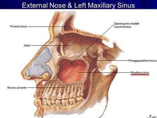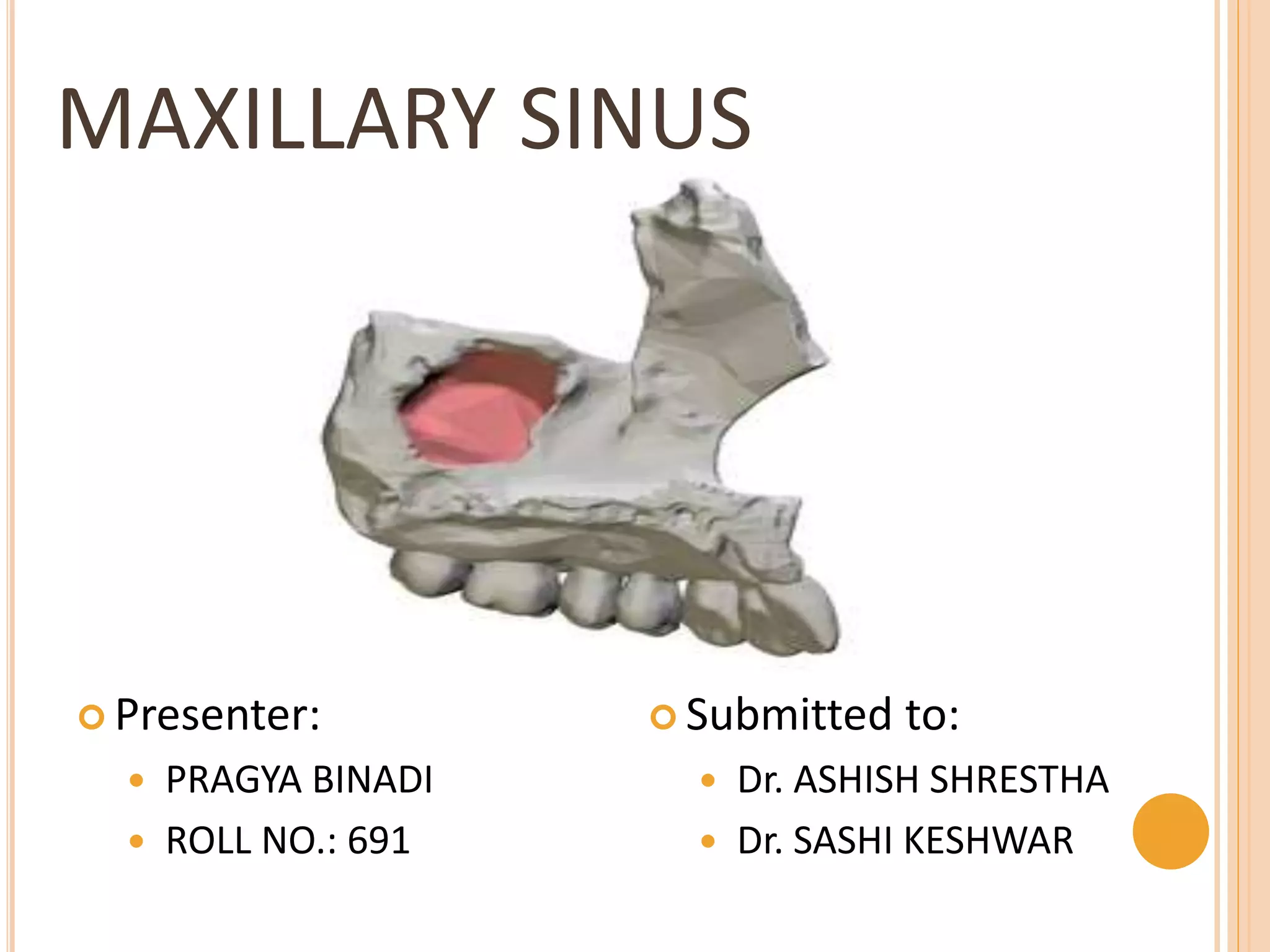 The document provides an overview of the maxillary sinus, including its anatomy, development, and clinical significance. It discusses the sinus's definition, structure, blood and nerve supply, and functions, as well as potential clinical issues such as infections and dental complications. Additionally, it covers developmental anomalies linked to various syndromes impacting the maxillary sinus.