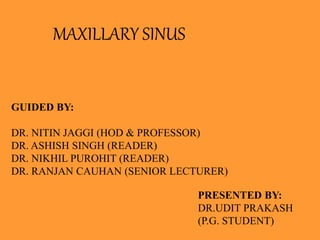 This document provides an overview of the maxillary sinus and sinus lift procedure. It discusses the anatomy of the maxillary sinus, including its dimensions and walls. It then describes the sinus lift procedure, which increases bone mass below the sinus floor to allow for dental implant placement. Several techniques for performing a sinus lift are outlined, including the lateral window approach, osteotome approach, and hatch-reamer system. Pre-operative medications, follow-up considerations, potential complications, and contraindications are also summarized. Diagrams and images are included to illustrate the different approaches.