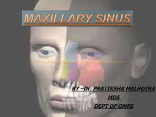The maxillary sinus is the largest of the paranasal sinuses. It is located within the body of the maxilla and has a pyramidal shape. The maxillary sinus develops during fetal development from the maxillary process and reaches its maximum size by age 18. It is important for functions like voice resonance and warming inhaled air. Disease processes like sinusitis, cysts, tumors or dental infections can involve the maxillary sinus. Radiographs are important for evaluating the sinus floor and its relationship to tooth roots. Surgical procedures may be needed to treat conditions like oroantral fistulas or remove foreign bodies from the sinus.