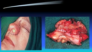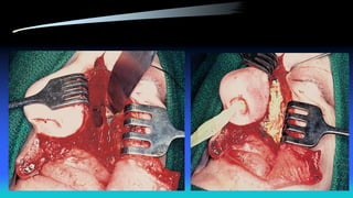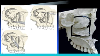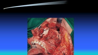The document discusses maxillectomy and craniofacial resection, detailing surgical procedures for removing the maxilla bone due to tumors, infections, and other conditions. It outlines indications, contraindications, various surgical approaches, preoperative evaluations, and postoperative considerations, as well as reconstruction options and complications associated with these procedures. Key surgical techniques include medial maxillectomy, total maxillectomy with orbital exenteration, and anterior craniofacial resection, emphasizing the importance of proper tumor assessment and reconstruction goals.