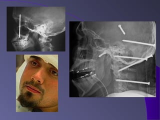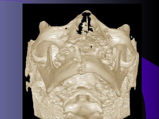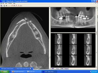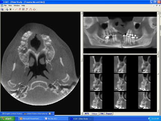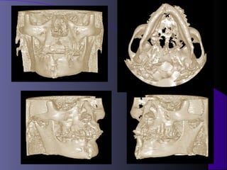 This document discusses various types of maxillofacial fractures seen on radiographs. It describes recent tooth fractures appearing as thin radiolucent lines through teeth. Alveolar fractures appear as sharply defined radiolucent lines in the alveolus. Mandibular condyle fractures involve the condylar head being "sheared off". Le Fort fractures are classified into types I, II, and III based on the anatomical structures involved. CT is the standard for evaluating maxillary fractures while panoramic radiography is best for the mandible.