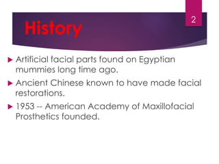 Maxillofacial prosthetics aims to restore function and aesthetics after defects caused by trauma, surgery, or congenital conditions. It involves both intraoral and extraoral prostheses made of materials like acrylics and silicone. Immediate prostheses are placed during or right after surgery to aid healing, while definitive prostheses are placed months later once healing is complete. Preprosthetic measures like vestibuloplasty and implants can improve prosthetic outcomes. The goal of extraoral prostheses for areas like the ear, orbit, and nose is cosmetic restoration through careful design and skin grafting or implant support if needed.