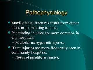This document discusses maxillofacial trauma, including the pathophysiology, etiology, anatomy, emergency management, history, physical examination, and treatment of various facial bone fractures including the frontal sinus, nasal bones, orbits, zygoma, maxilla, and mandible. Key points covered include airway management, hemorrhage control, imaging modalities like CT scans, fracture classifications like LeFort fractures, and the involvement of specialty services like ENT and neurosurgery.