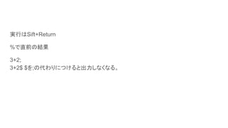 実行はSift+Return %で直前の結果 3+2; 3+2$ $を;の代わりにつけると出力しなくなる。