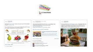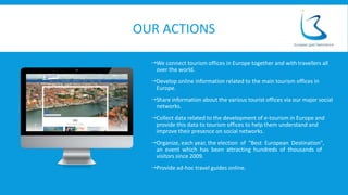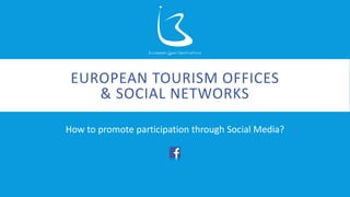 This document analyzes data from 283 European tourism offices' usage of social networks like Facebook, Twitter, YouTube, Google+, Instagram and Pinterest. It finds that 92% have a Facebook account with nearly 8 million total likes, and the top 3 destinations are Amsterdam, Lisbon and London. On Twitter, 81% have accounts with 1.5 million total followers, led by London, Manchester and Amsterdam. The document provides tips for tourism offices to strengthen participation on social media, such as being online, connected, creative, honest and curious.