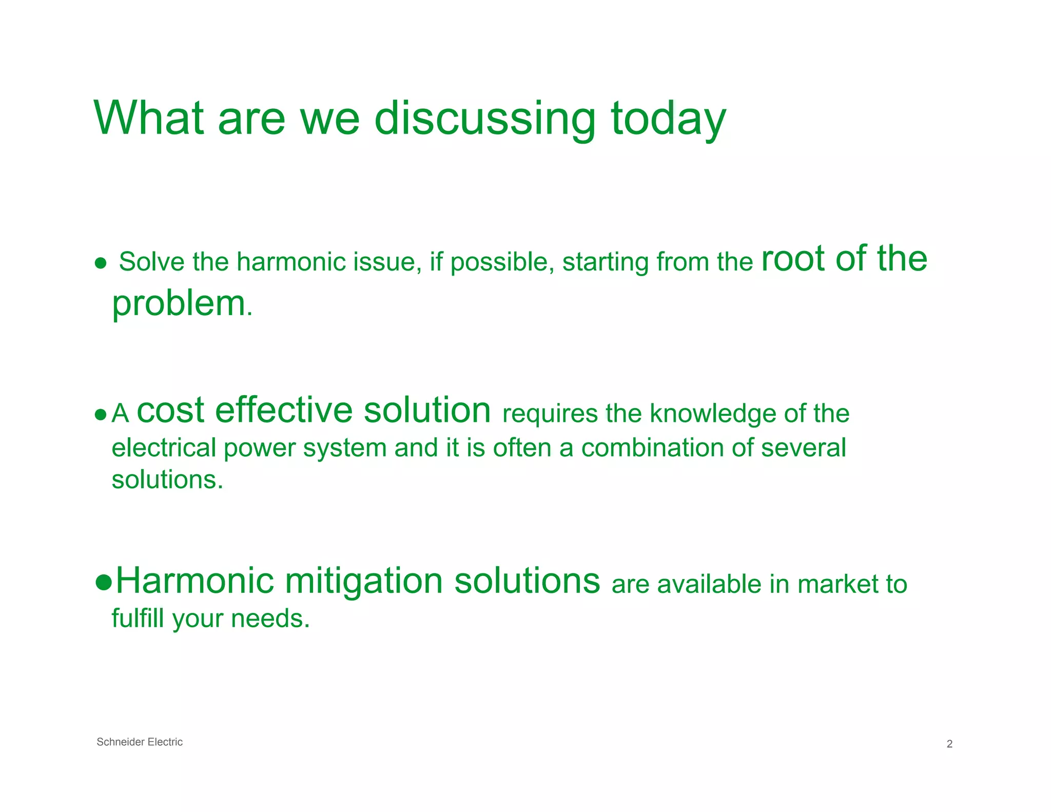 This document discusses harmonic mitigation solutions for electrical networks affected by harmonics from nonlinear loads such as variable speed drives. It begins by explaining the causes of harmonics and providing examples of typical harmonic waveforms. It then outlines various harmonic mitigation approaches including line and DC chokes, passive filters, zero-sequence harmonic filters, drive isolation transformers, multipulse drives, active harmonic filters, and active front ends. For each solution, it discusses advantages and limitations. The document aims to help readers understand harmonic issues and choose appropriate mitigation methods.