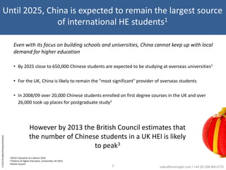This document discusses research conducted by Evolution on maximizing postgraduate potential from China. It finds that while the UK remains a preferred destination, competition is increasing. Chinese students now value experiences beyond just studying overseas. The document advertises Evolution's reports on segmenting Chinese student markets and mapping their decision journey, claiming these provide actionable frameworks to develop effective international recruitment strategies.