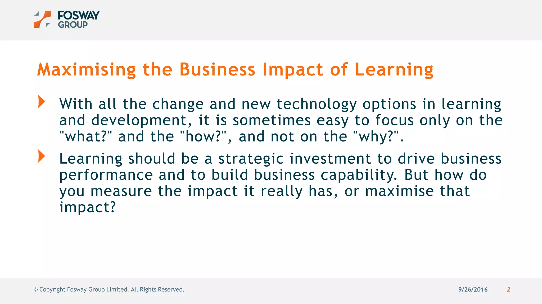 The document discusses maximizing the business impact of learning. It notes that learning should be a strategic investment to drive business performance, but that it can be difficult to measure its actual impact or maximize that impact. It discusses opportunities and challenges, including the need to focus on impact rather than just activity. It also provides examples of measuring business impact in action and discusses the promise of analytics for learning impact measurement.