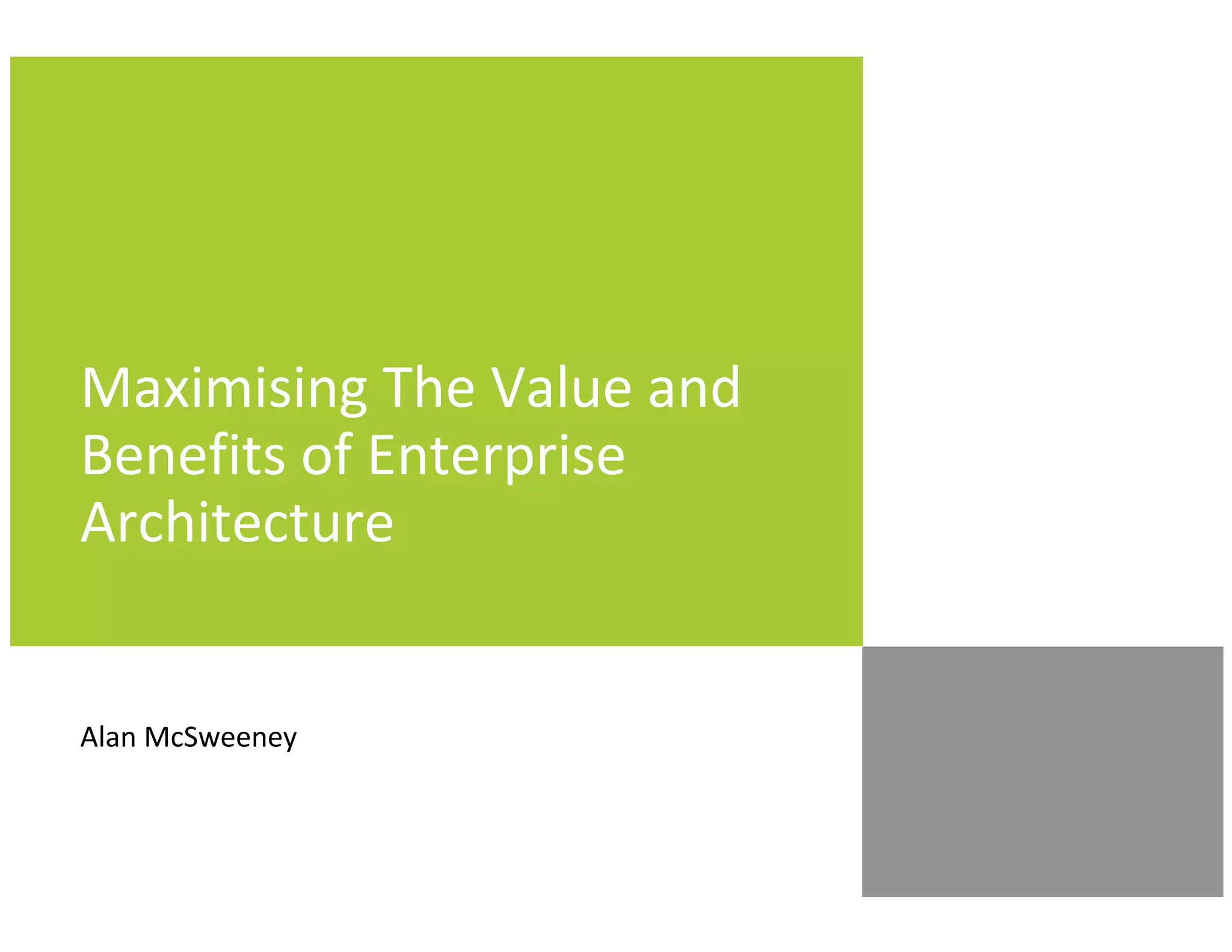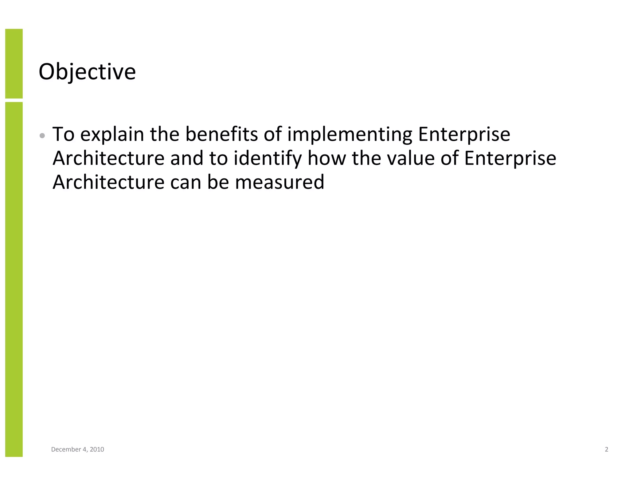 1) The benefits of EA such as aligning IT with business strategy and reducing IT complexity.