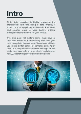 The document discusses essential AI tools for data analysts to enhance productivity and streamline data analysis processes. Key tools highlighted include automated machine learning platforms, natural language processing tools, data visualization tools, and automated data cleaning solutions, among others. The conclusion emphasizes that while AI tools can automate many tasks, the analyst's expertise in data interpretation and contextual understanding remains vital.