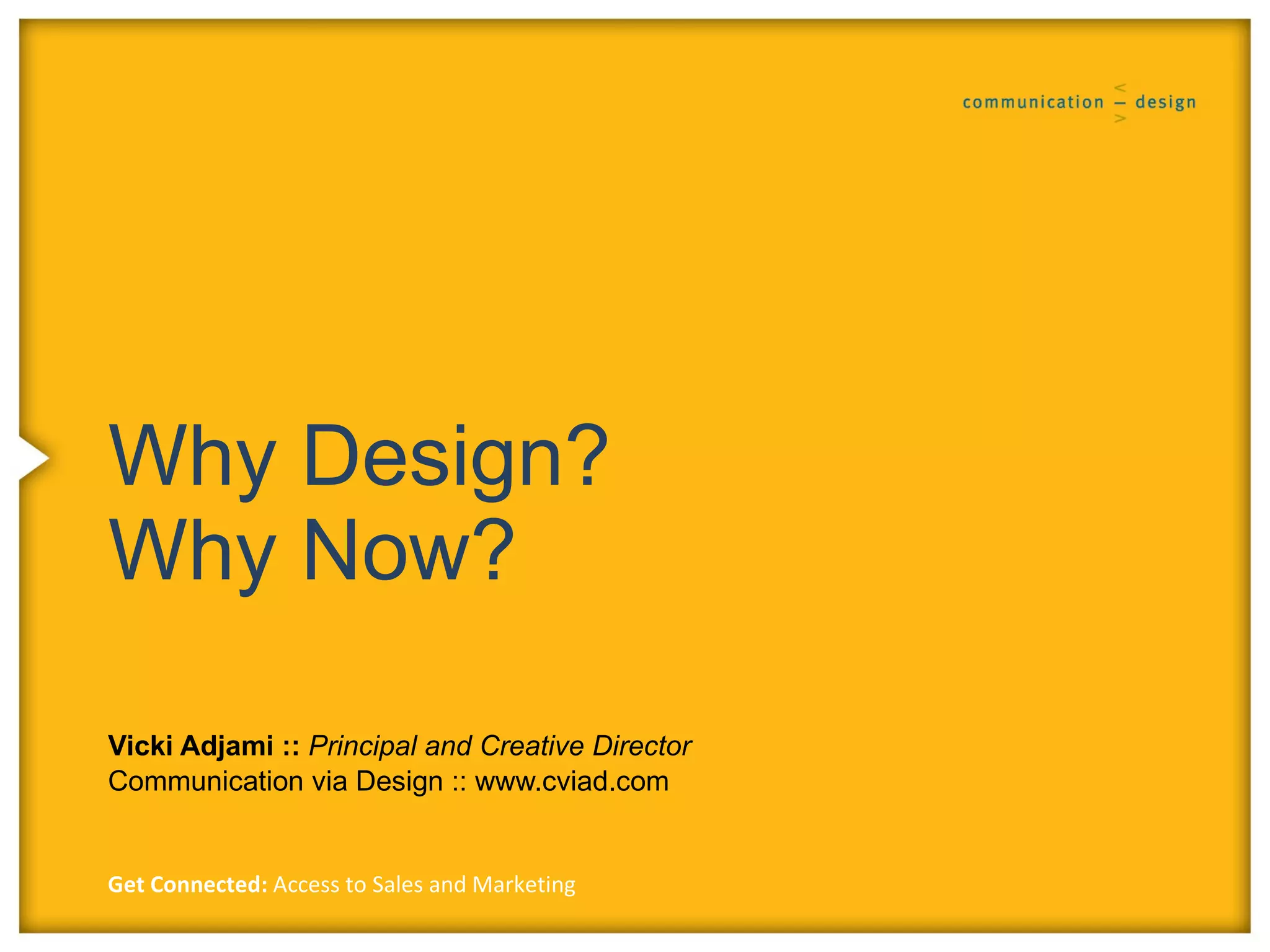The document discusses why design is important, especially during an economic downturn. It notes that over half of major company marketing directors see a downturn as a good time to rebrand. A strong, cohesive brand establishes a consistent presence and communicates a company's value internally and externally. The document provides examples of branding work and argues that now is a good time to invest in design due to low costs and the ability to gain competitive advantages that will help in the future as the economy recovers. Consistency, cohesiveness and standing out from competitors are important.