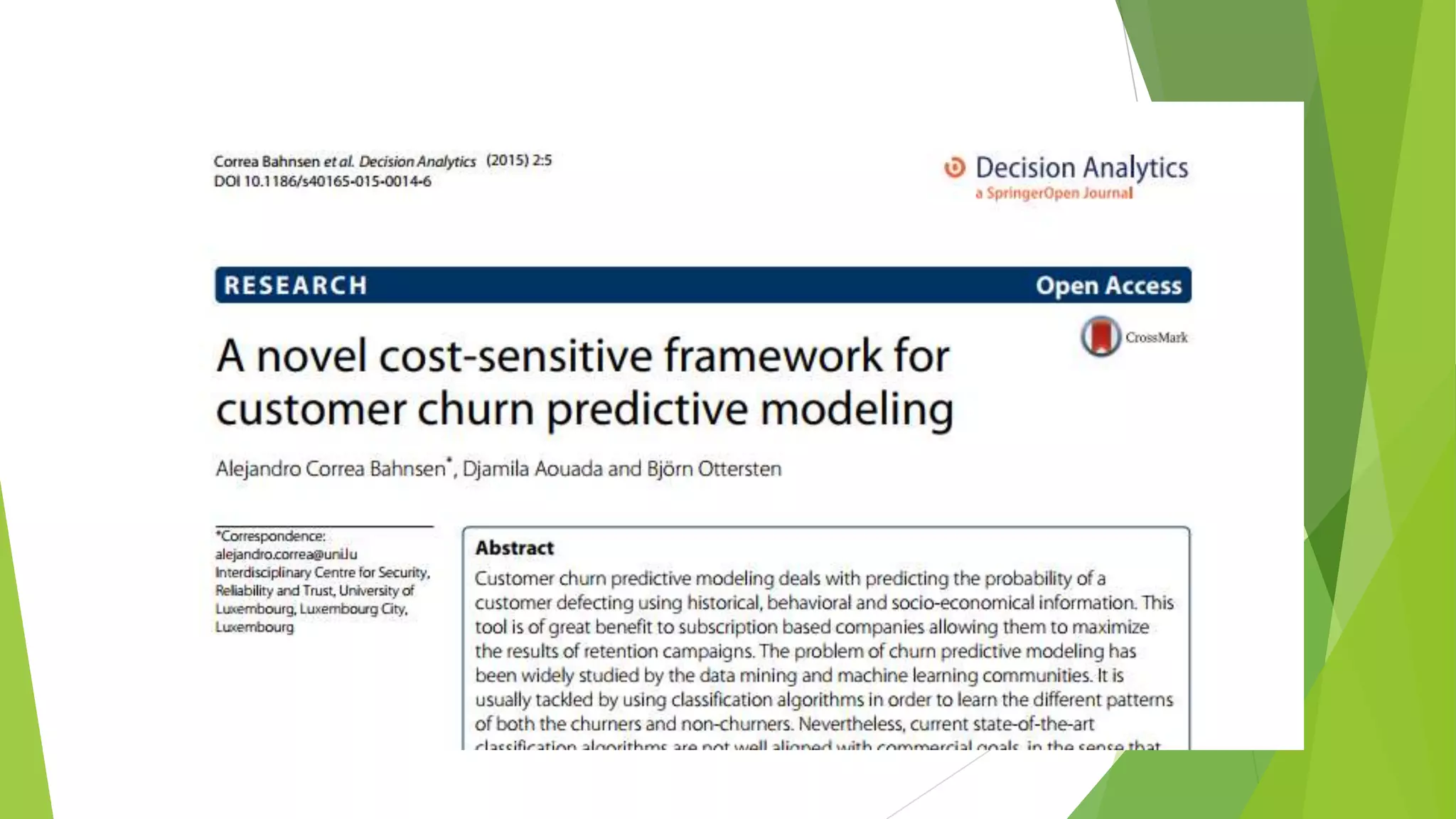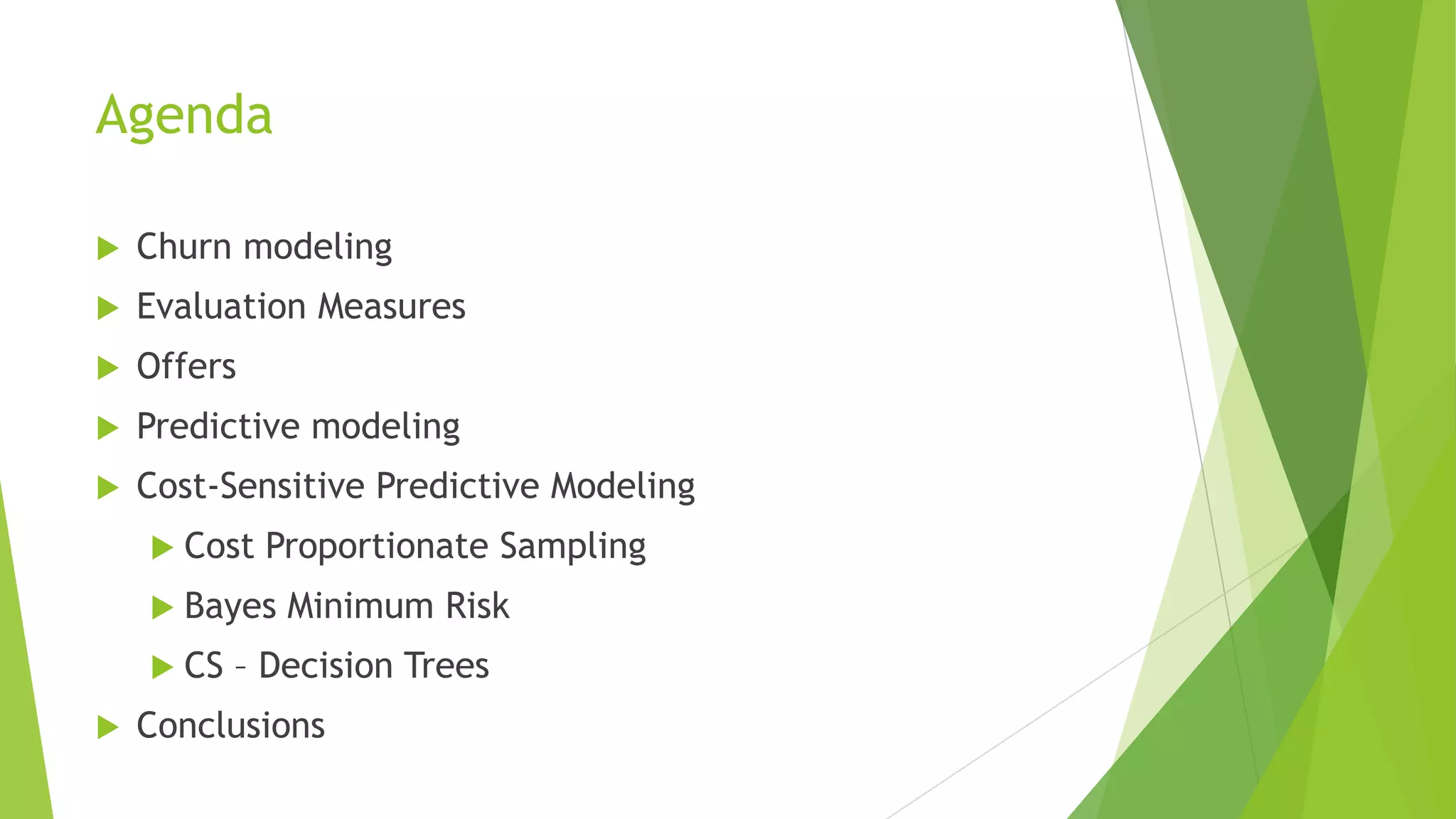 This document summarizes a presentation on maximizing profit from customer churn prediction models using cost-sensitive machine learning techniques. It discusses how traditional evaluation measures like accuracy do not account for different costs of prediction errors. It then covers cost-sensitive approaches like cost-proportionate sampling, Bayes minimum risk, and cost-sensitive decision trees. The results show these cost-sensitive methods improve savings over traditional models and sampling approaches when the business costs are incorporated into the predictive modeling.