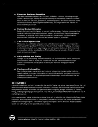 The document discusses the importance of predictive modeling in optimizing paid media campaigns to maximize return on investment (ROI). It highlights enhanced audience targeting, optimal budget allocation, ad creative optimization, and proper timing as key benefits that predictive modeling brings to digital marketing strategies. Ultimately, it emphasizes that utilizing data-driven insights through predictive modeling can lead to more efficient marketing efforts and better business outcomes.
