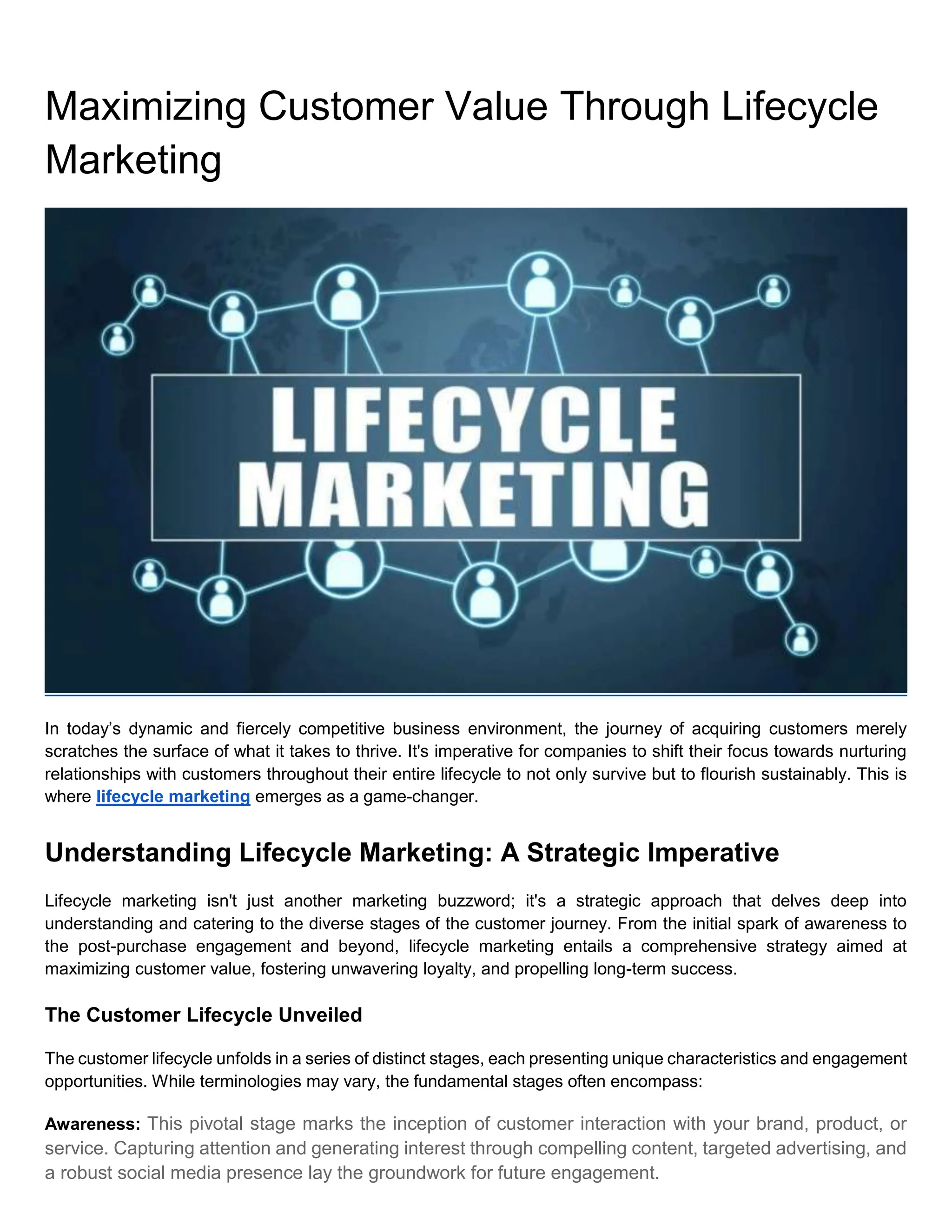 In today’s dynamic and fiercely competitive business environment, the journey of acquiring customers merely scratches the surface of what it takes to thrive. It's imperative for companies to shift their focus towards nurturing relationships with customers throughout their entire lifecycle to not only survive but to flourish sustainably. This is where lifecycle marketing emerges as a game-changer.