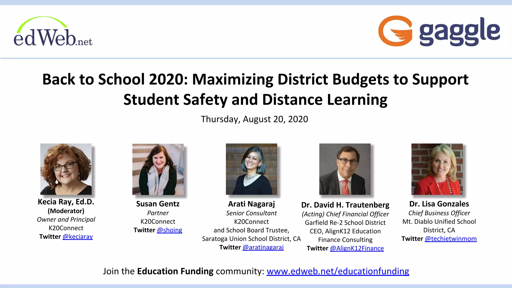 The document discusses strategies for maximizing district budgets to support student safety and distance learning amid the challenges posed by COVID-19. It features insights from various education experts on funding opportunities and management, emphasizing the importance of strategic planning, creative use of resources, and ensuring fiscal solvency during uncertain times. Additionally, it highlights the role of technology in enhancing student safety and the community's involvement in supporting educational resources.