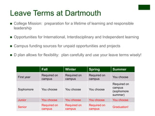 The document outlines the importance of maximizing leave terms at Dartmouth College, emphasizing academic, internship, and personal growth opportunities during these periods. It provides examples of internships, faculty-mentored research projects, and resources available for planning and conducting leave terms effectively. Additionally, it highlights partnerships with international institutions and various support systems for students to prepare for their leave opportunities.