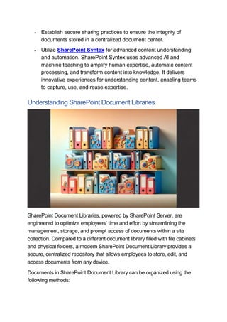 The document discusses how to maximize productivity using SharePoint Document Library by implementing organization techniques, enhancing collaboration through co-authoring and version control, and utilizing automation features. Key strategies include leveraging metadata, establishing secure sharing practices, and creating a centralized document center to streamline document management and ensure a single source of truth. By adopting these tactics, organizations can significantly improve their document management efficiency and collaboration capabilities.