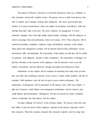 Greene's Groceries is a small, local grocery store with 15 cashiers and 5 managers. The document discusses Greene's objectives for cashiers and managers, which include being productive, efficient, and creating high-quality relationships. Cashier performance will be evaluated based on items scanned per hour and customer service surveys, while manager performance will be evaluated based on cashier turnover rates and surveys. The document also discusses challenges like economic conditions, wage competition, and whether Greene's should take a satisficing or maximizing approach to decisions.