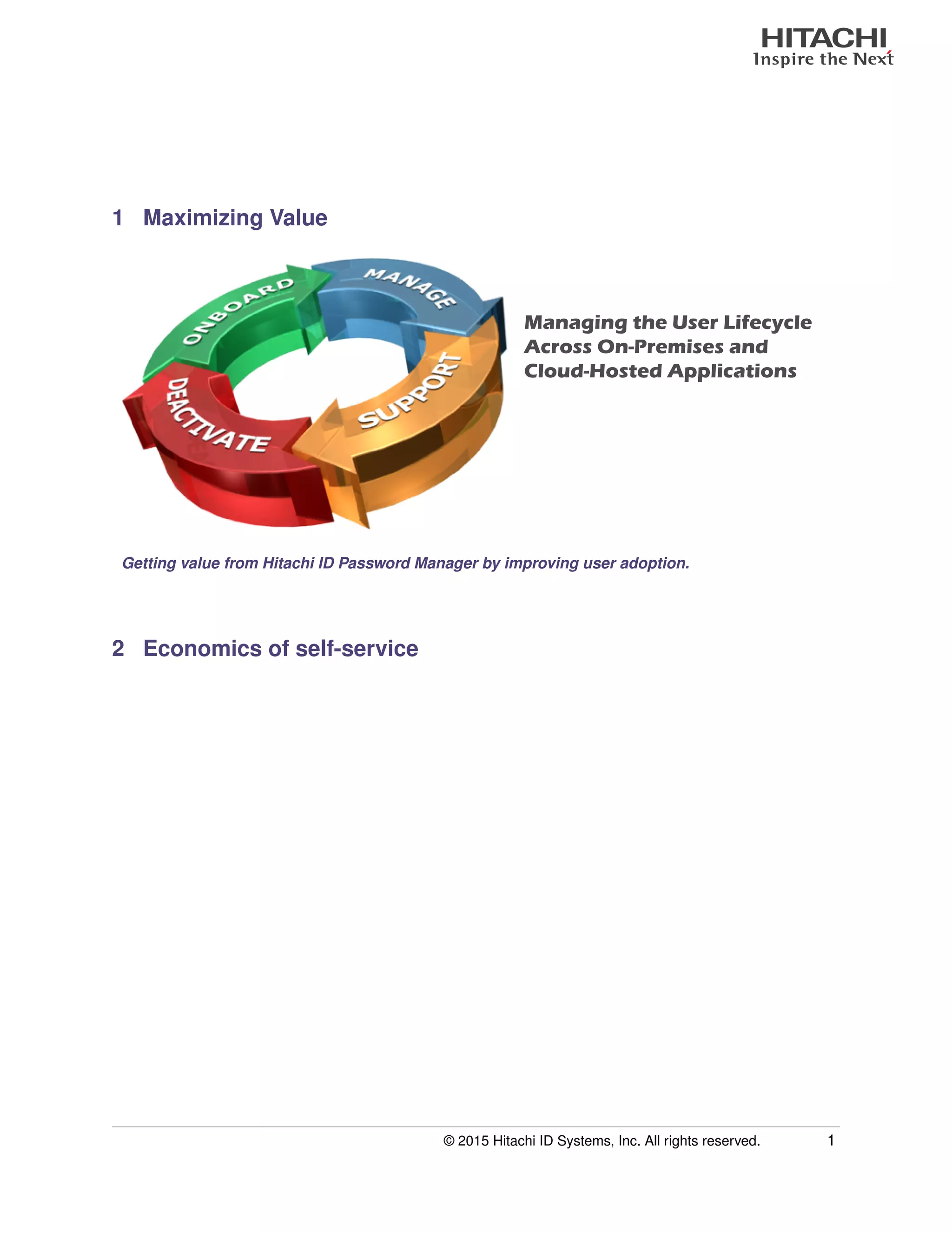 The document discusses strategies to maximize user adoption of self-service password management solutions in organizations, emphasizing the importance of awareness, accessibility, and willingness. It highlights the economic benefits of self-service, including cost savings and increased productivity, while warning against common pitfalls such as failing to synchronize passwords. Effective project management, including executive sponsorship and clear objectives, is essential for driving user engagement and achieving high rates of adoption.