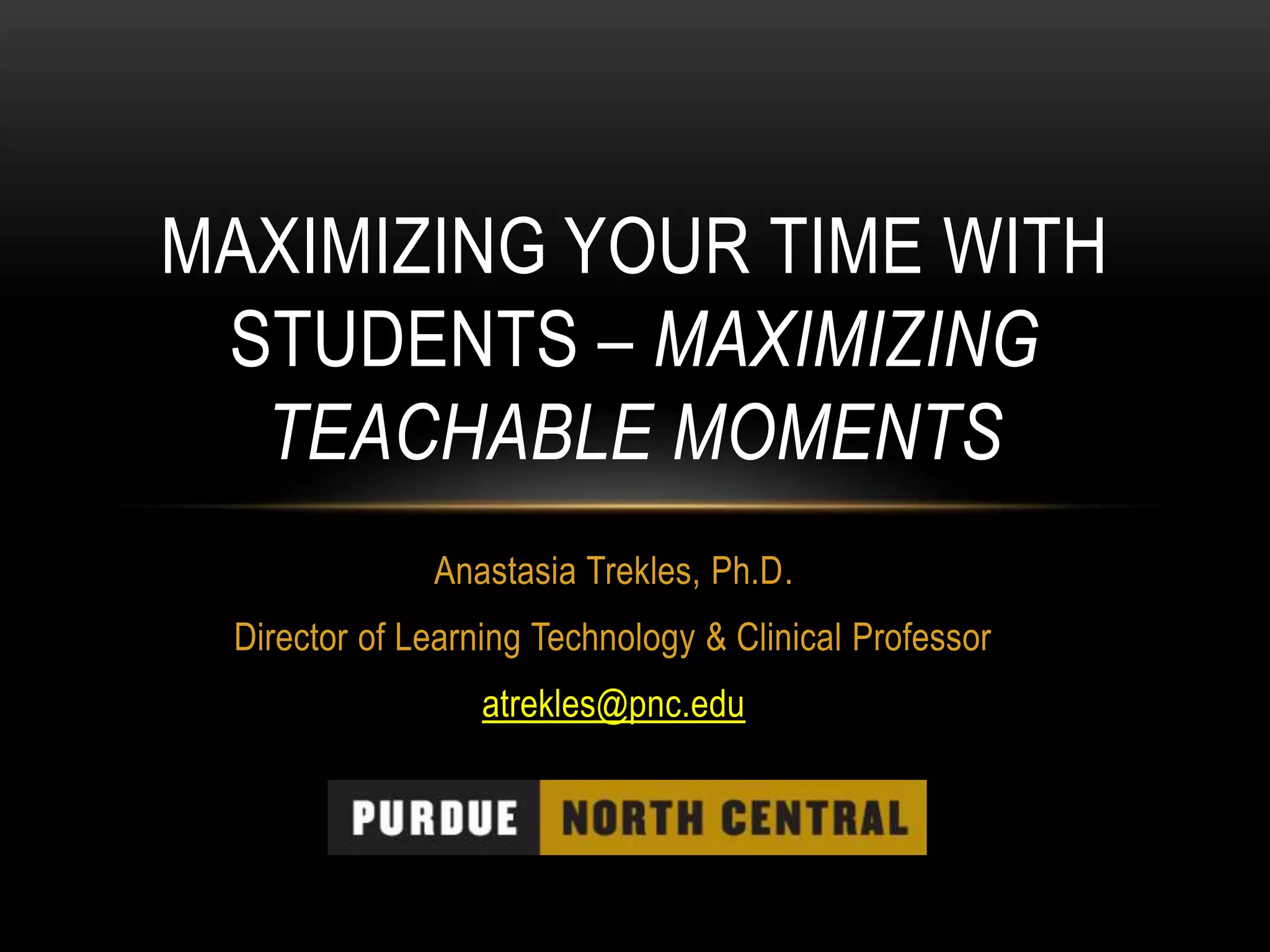 The document discusses strategies for maximizing teaching effectiveness through technology, emphasizing the importance of focusing on essential tools rather than trying to learn everything available. It introduces the concept of 'flipping the classroom,' where students receive instruction at home and engage in deeper learning during class, and offers resources for effective implementation. Additionally, various technology tools are presented to enhance productivity, collaboration, and organization in the educational environment.